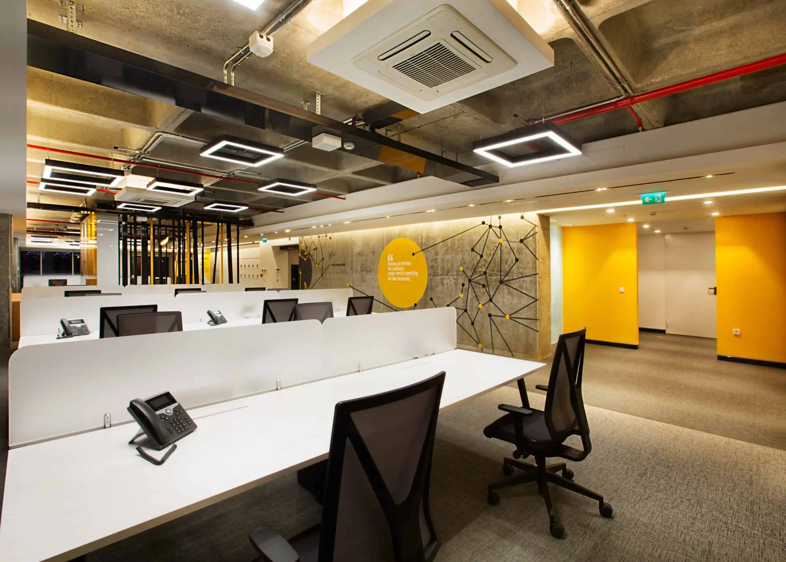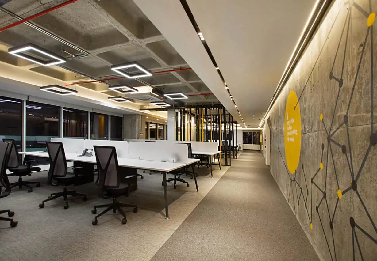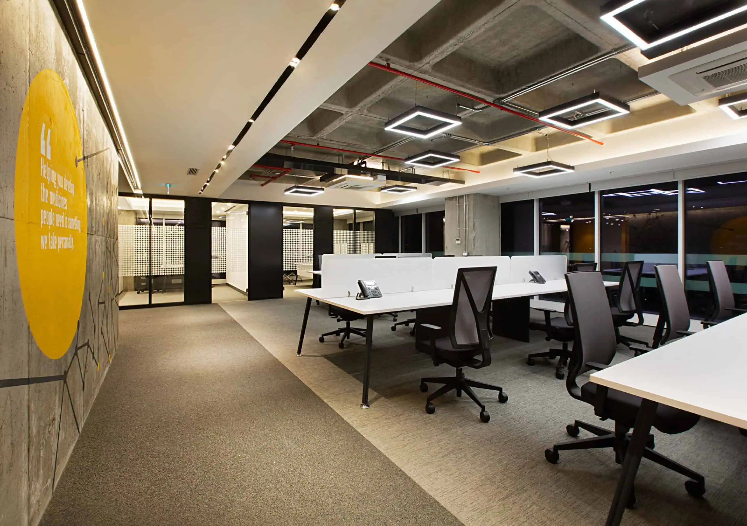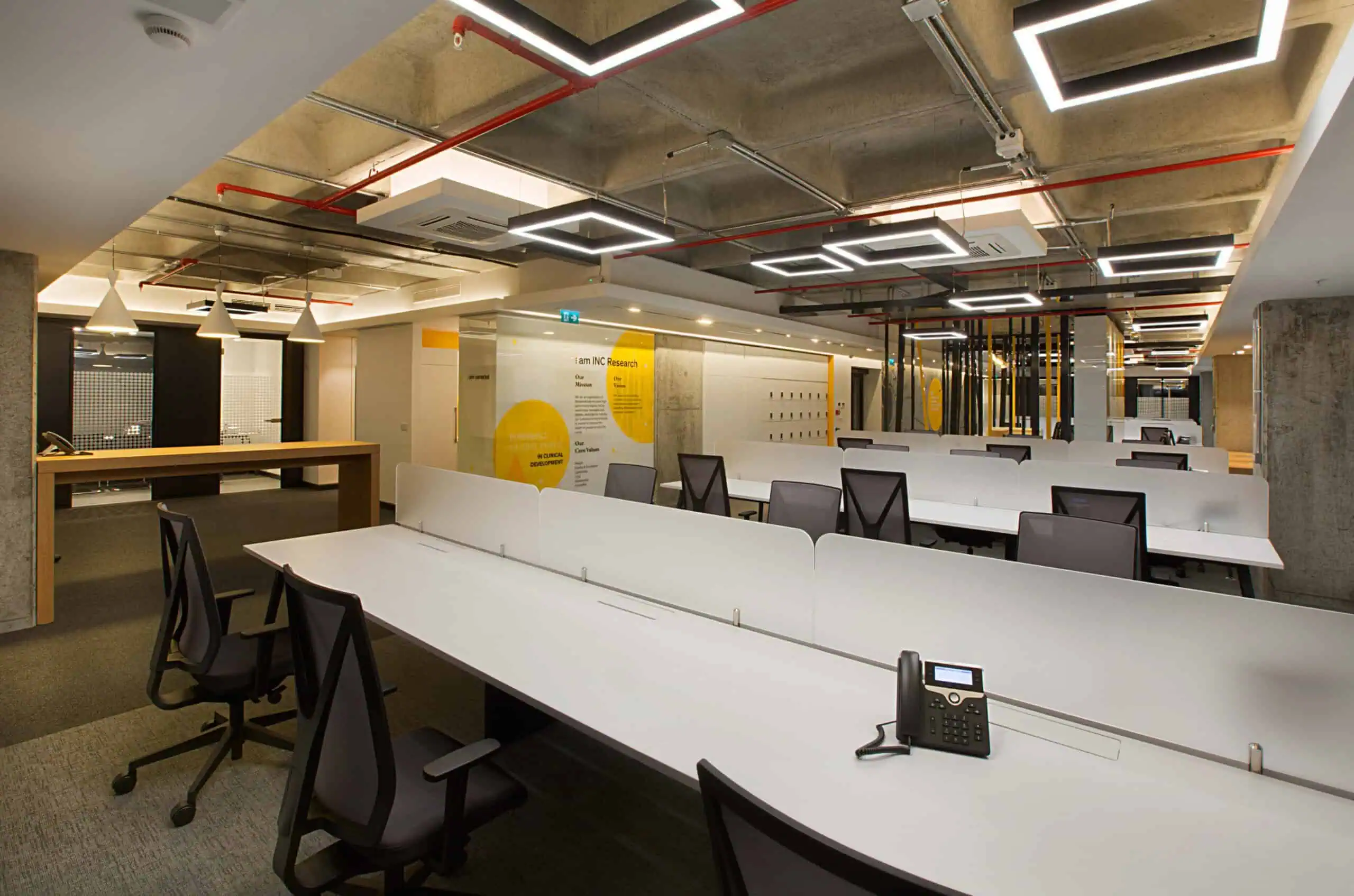 The office layout embraces a minimalist approach with an open, well-structured plan ensuring efficiency and fluidity. Custom graphic elements reflect INC Research’s corporate identity, while the raw concrete coffer slabs of Nida Kule combined with a grid of square strip lighting add depth and rhythm. As in all Avcı Architects’ projects, local and natural materials emphasize a sustainable design philosophy.