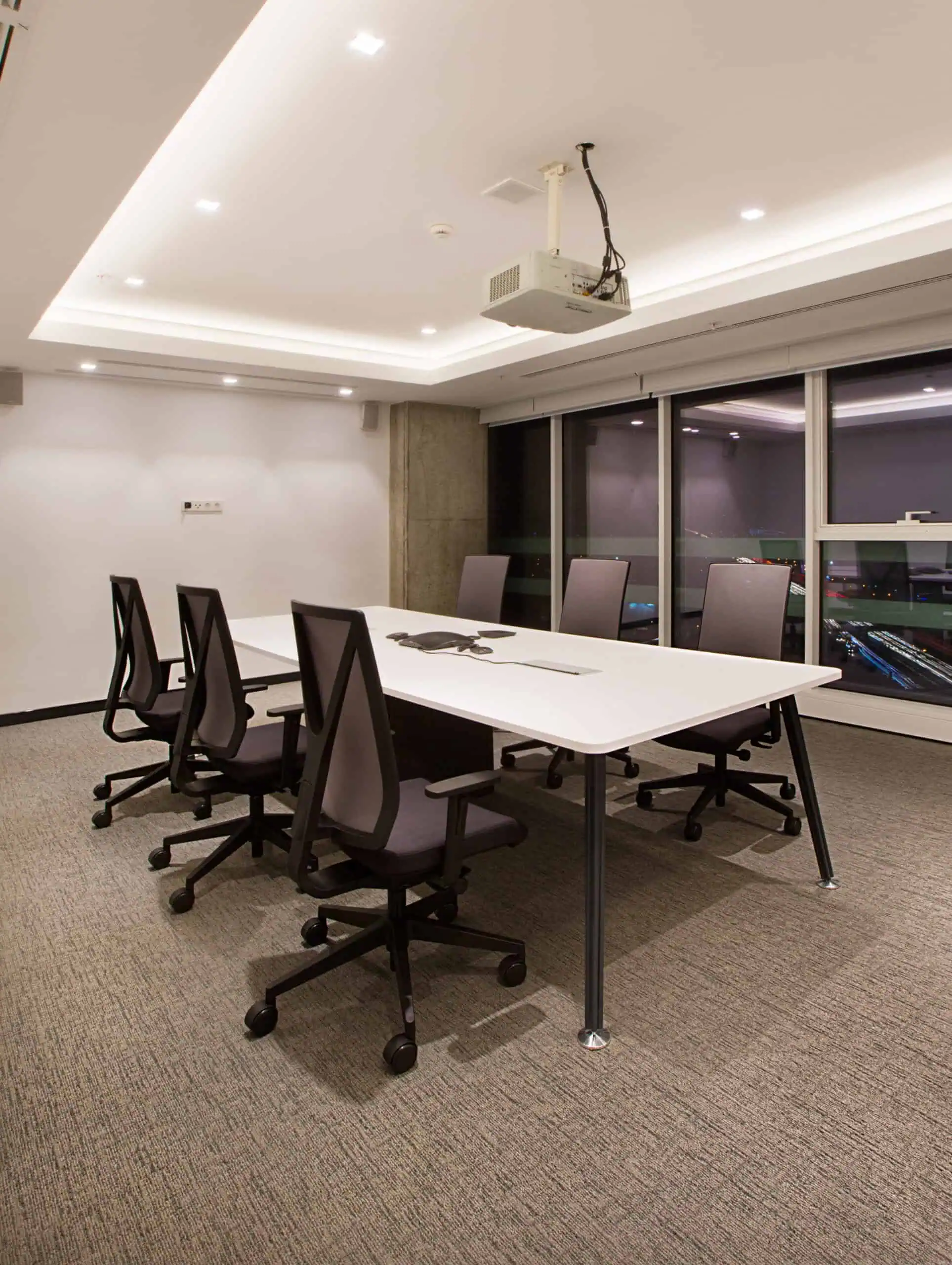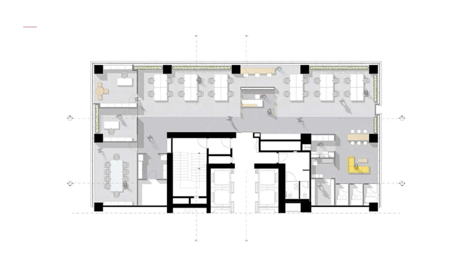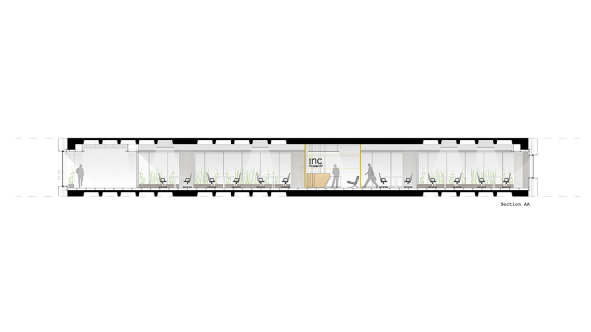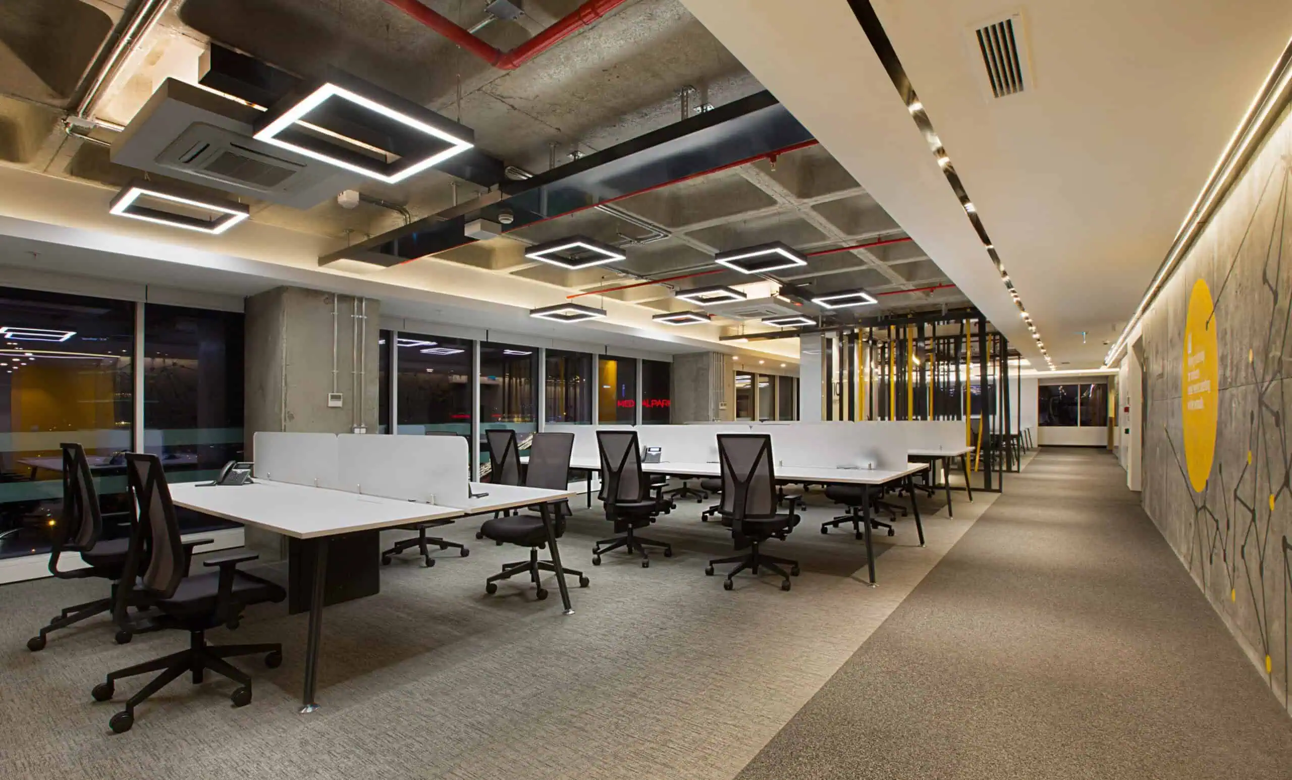 The office layout embraces a minimalist approach with an open, well-structured plan ensuring efficiency and fluidity. Custom graphic elements reflect INC Research’s corporate identity, while the raw concrete coffer slabs of Nida Kule combined with a grid of square strip lighting add depth and rhythm. As in all Avcı Architects’ projects, local and natural materials emphasize a sustainable design philosophy.