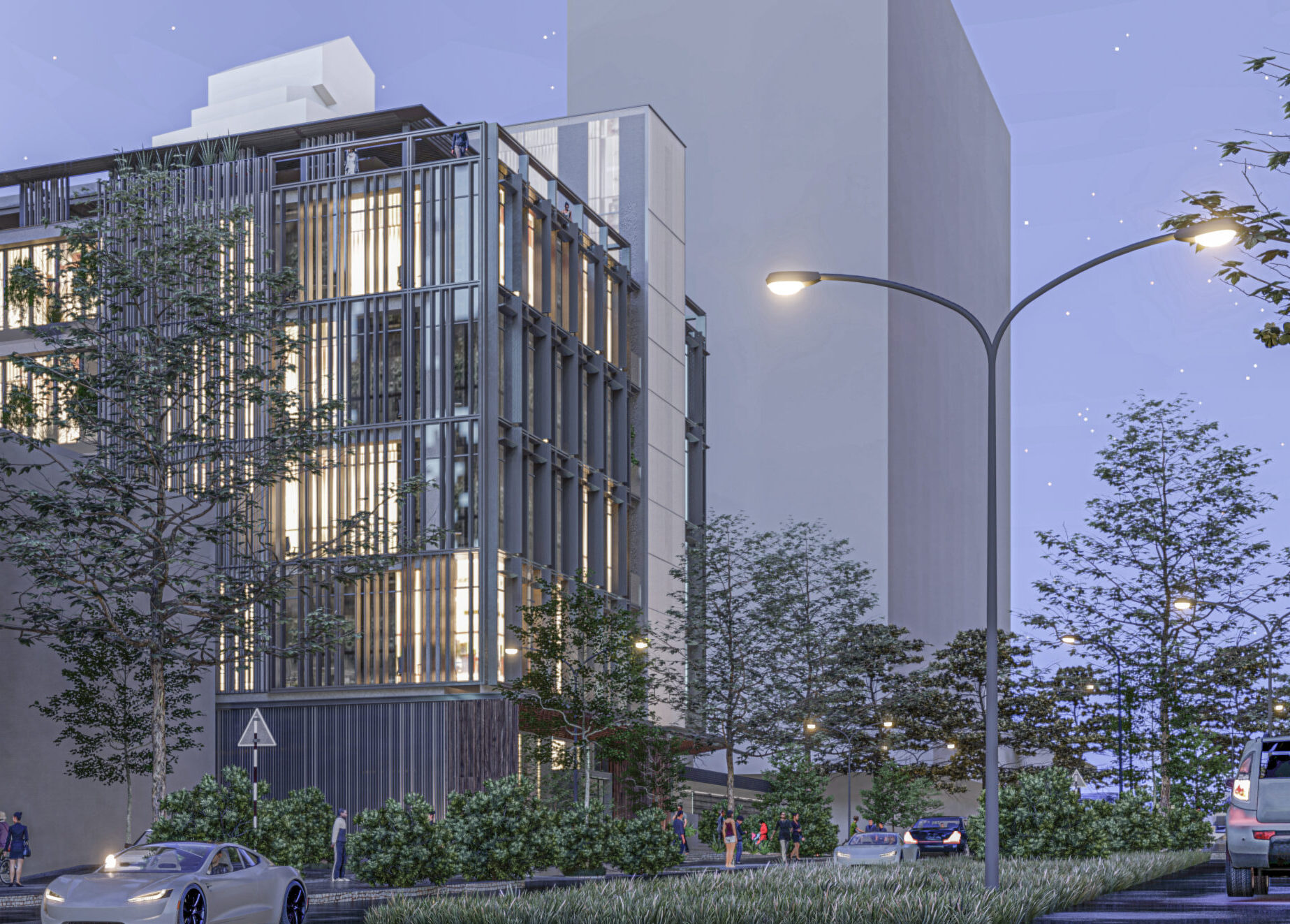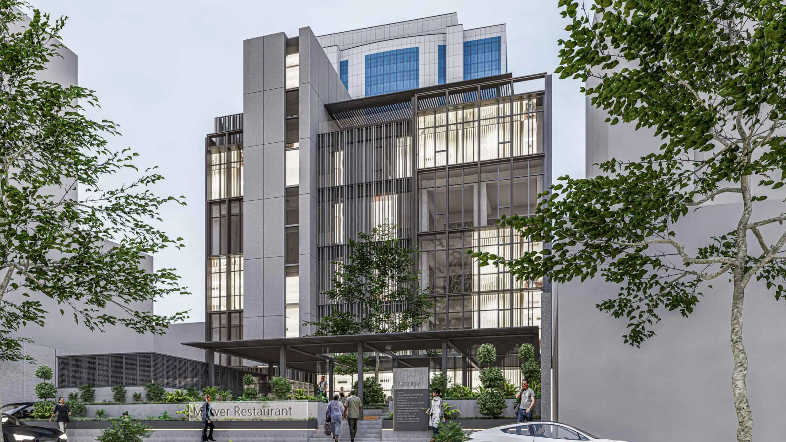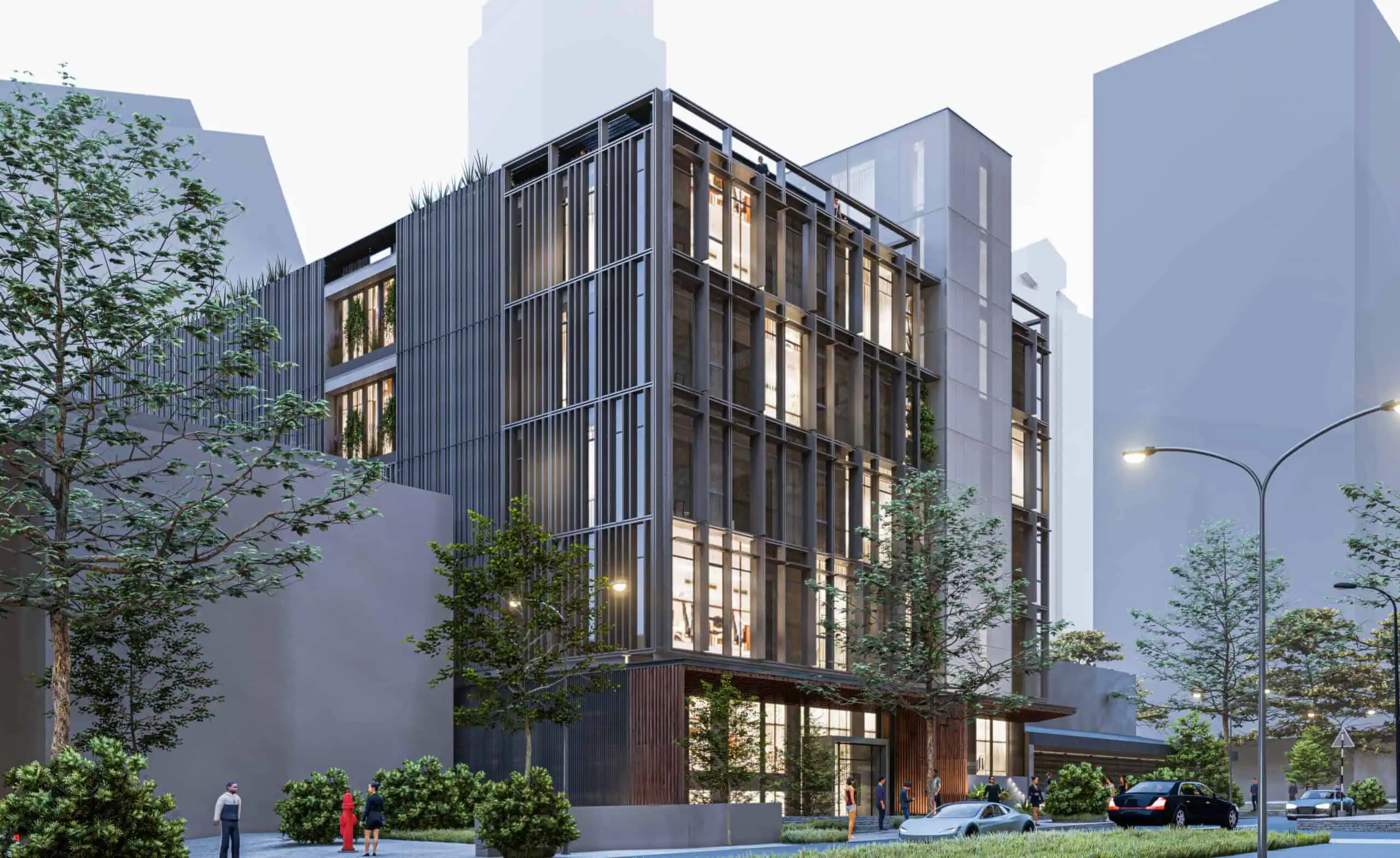 Rather than mimic its neighbors, the building’s new facade asserts a vertical language of clarity and depth: Custom-designed shading devices enrich both environmental performance and visual depth , Transparent, operable glazing systems balance daylight and ventilation , Side facades are softened with planters and set-back window frames, creating green punctuation along the street . The facade acts as a mediator between building and boulevard, setting the tone for the user experience inside.