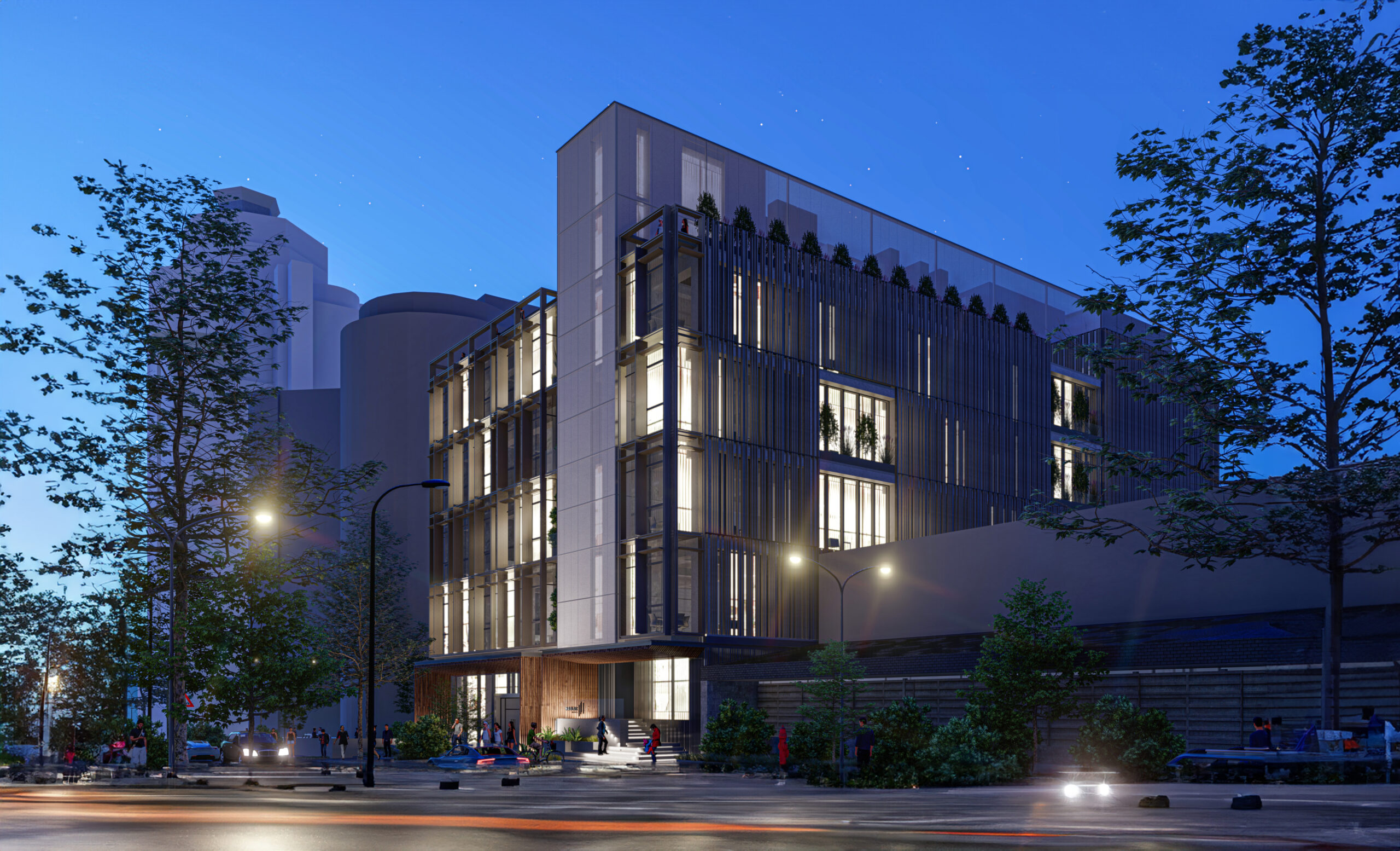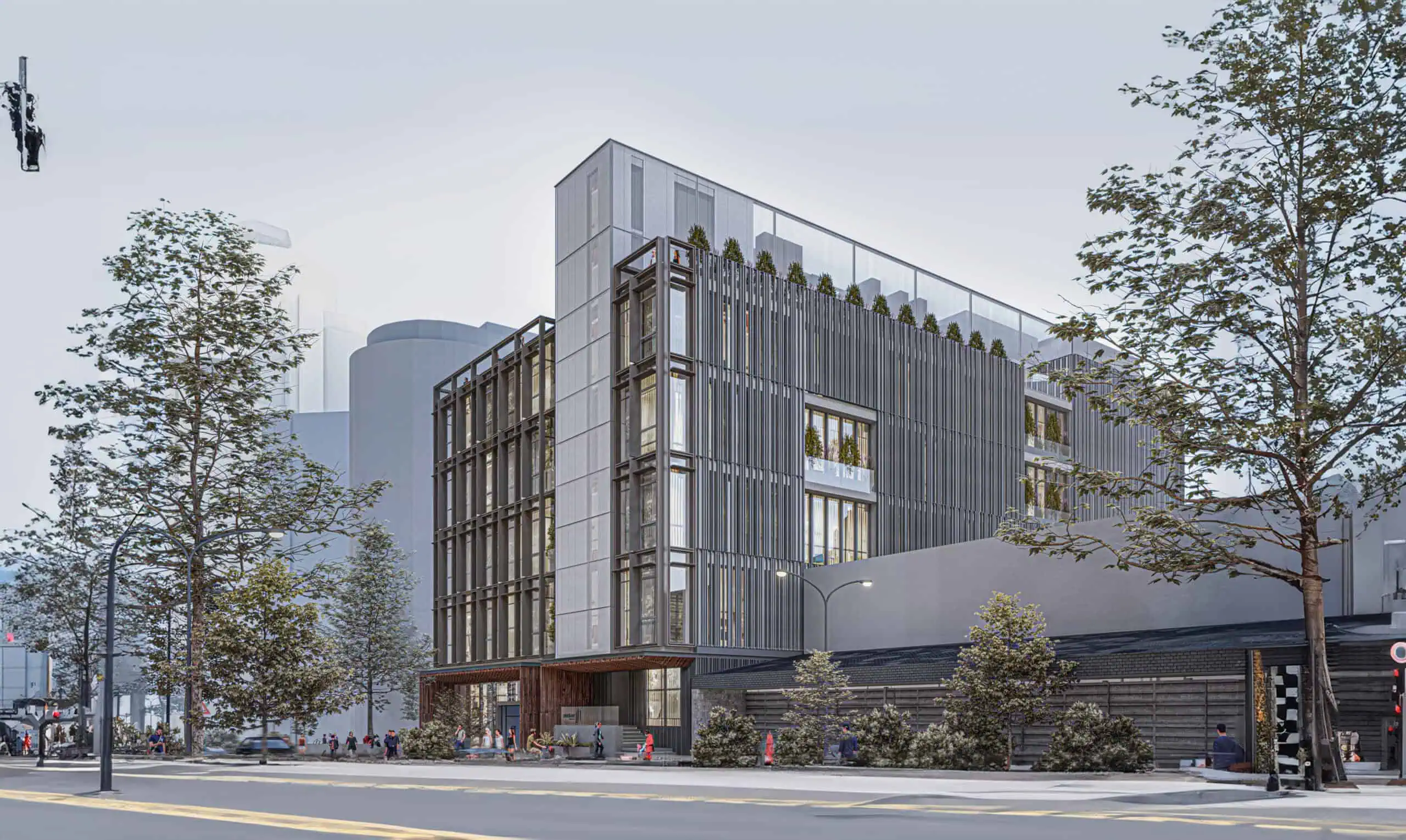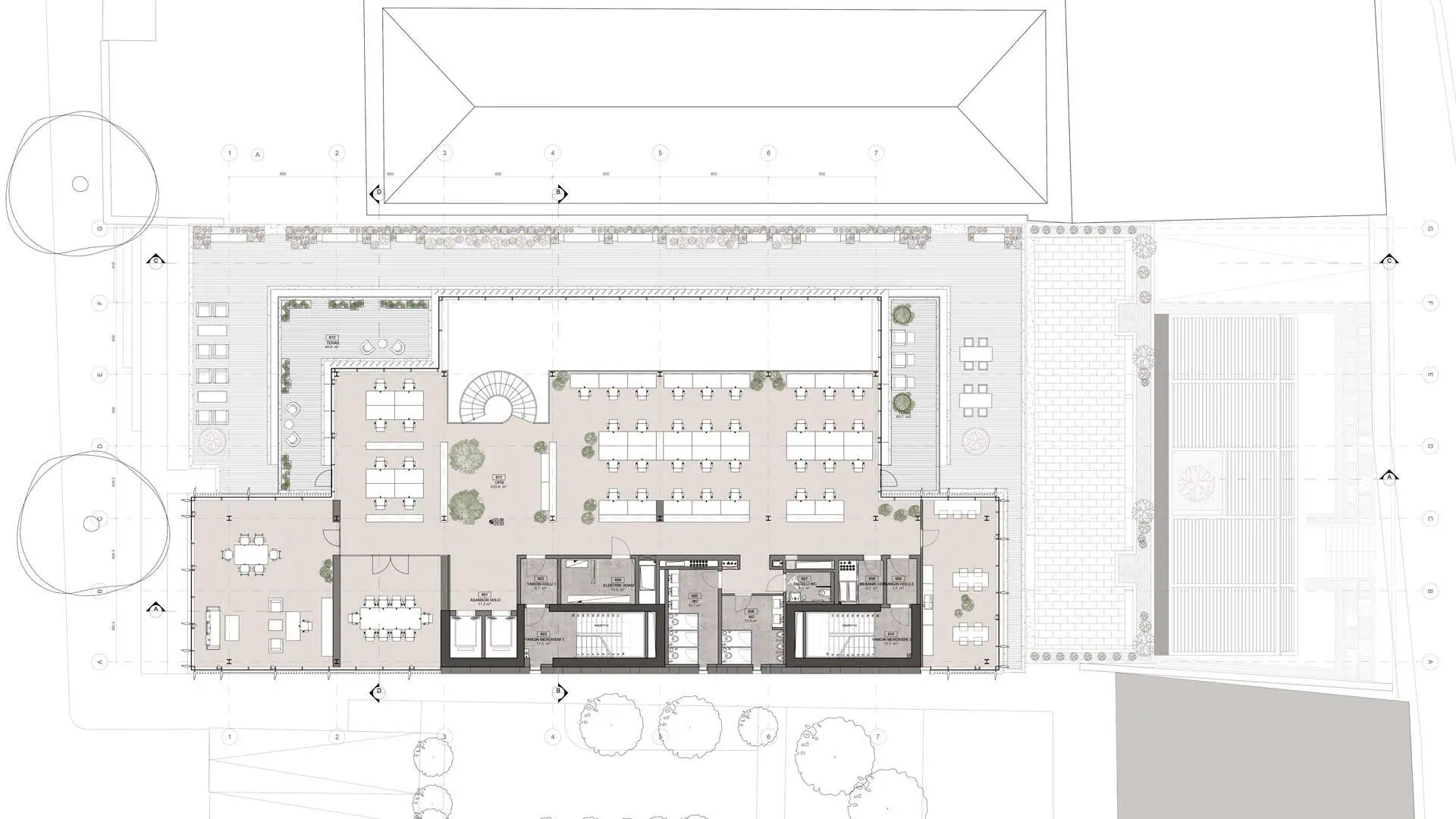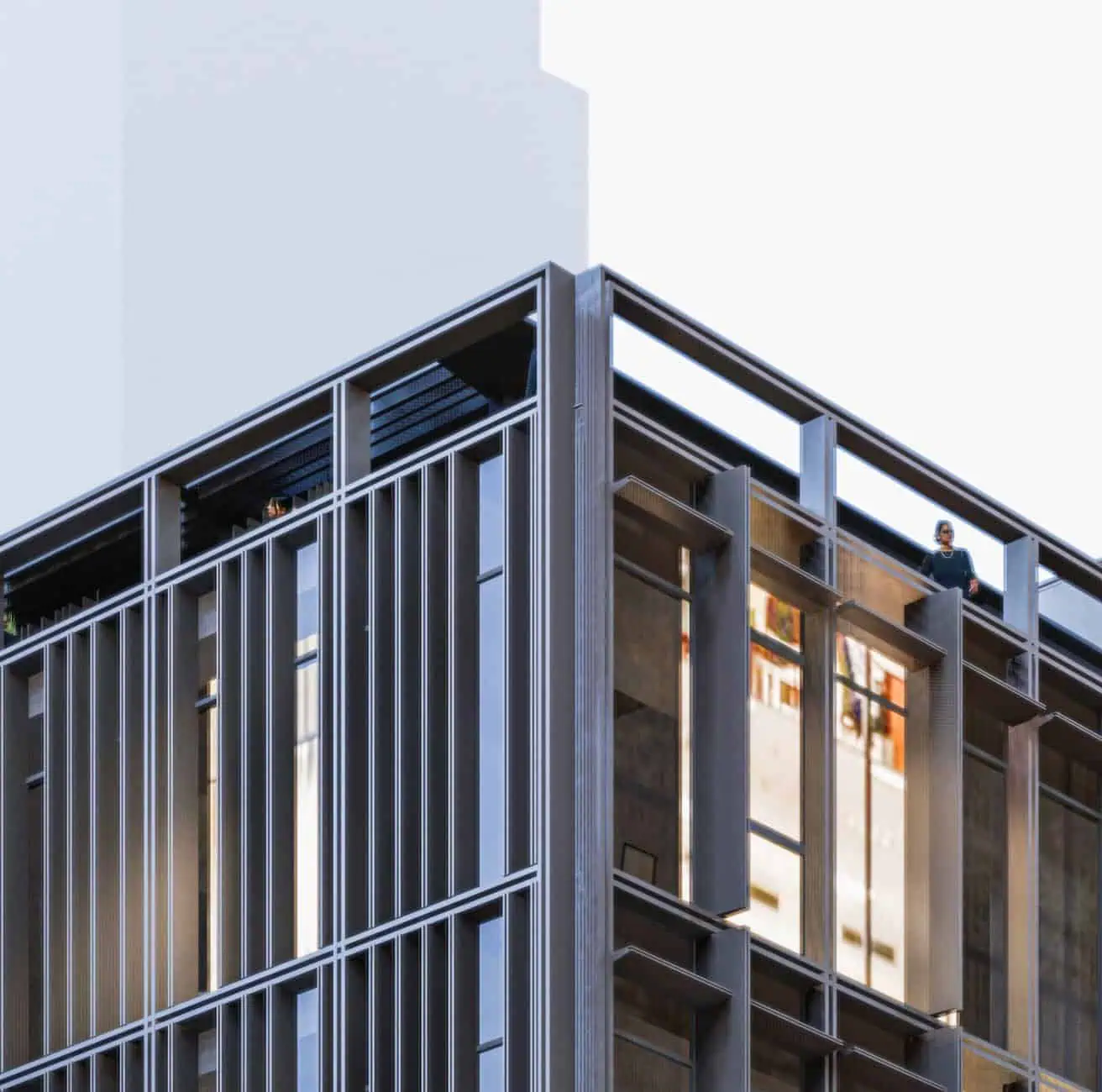 Rather than mimic its neighbors, the building’s new facade asserts a vertical language of clarity and depth: Custom-designed shading devices enrich both environmental performance and visual depth , Transparent, operable glazing systems balance daylight and ventilation , Side facades are softened with planters and set-back window frames, creating green punctuation along the street . The facade acts as a mediator between building and boulevard, setting the tone for the user experience inside.