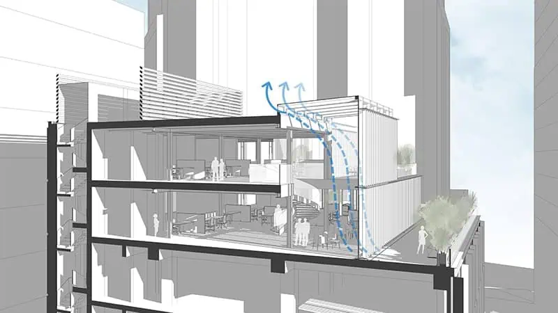 Passive ventilation strategies improve air quality while reducing energy demand in upper-level workspaces.